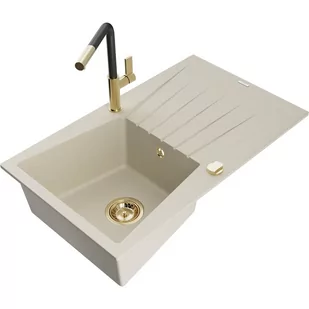 Beżowy Kolor baterii: Czarny/Złoty Dane techniczne: Zlewozmywak: Rozmiar: 775x470x200 mm Głębokość komory: 180 mm Wymiary komory: