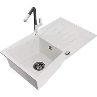 Biały Kolor baterii: Czarny/Chrom Dane techniczne: Zlewozmywak: Rozmiar: 775x470x200 mm Głębokość komory: 180 mm Wymiary komory: