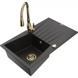 Czarny/Złoty metalik Kolor baterii: Złoty Dane techniczne: Zlewozmywak: Rozmiar: 775x470x200 mm Głębokość komory: 180 mm Wymiary komory: