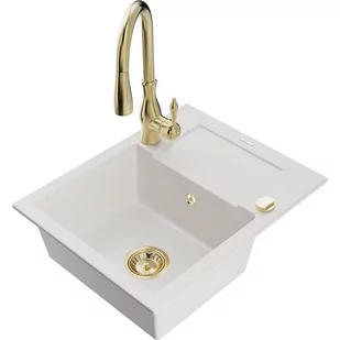 Biały Kolor baterii: Złoty Dane techniczne: Zlewozmywak: Rozmiar: 576x465x174 mm Głębokość komory: 164 mm Wymiary komory: