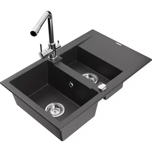 Czarny nakrapiany Kolor baterii: Chrom Dane techniczne: Zlewozmywak: Rozmiar: 737x475x177 mm Głębokość komory: 167 mm (większa), 107 mm (mniejsza) Wymiary komory: