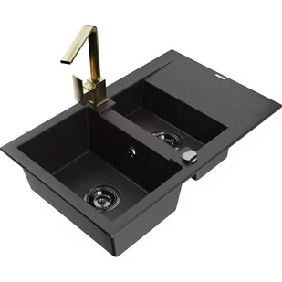 Czarny/Złoty metalik Kolor baterii: Złoty Dane techniczne: Zlewozmywak: Rozmiar: 737x475x177 mm Głębokość komory: 167 mm (większa), 107 mm (mniejsza) Wymiary komory: