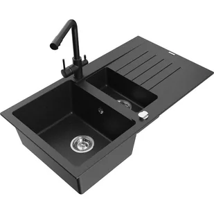 Czarny/Srebrny metalik Kolor baterii: Czarny Dane techniczne: Zlewozmywak: Rozmiar: 900x505x200 mm Głębokość komory: 180 mm (większa), 115 mm (mniejsza) Wymiary komory: