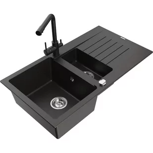Czarny/Złoty metalik Kolor baterii: Czarny Dane techniczne: Zlewozmywak: Rozmiar: 900x505x200 mm Głębokość komory: 180 mm (większa), 115 mm (mniejsza) Wymiary komory:
