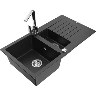 Czarny/Srebrny metalik Kolor baterii: Chrom Dane techniczne: Zlewozmywak: Rozmiar: 900x505x200 mm Głębokość komory: 180 mm (większa), 115 mm (mniejsza) Wymiary komory: