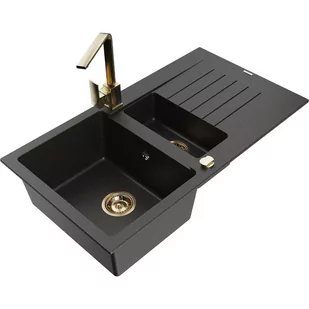 Czarny/Złoty metalik Kolor baterii: Złoty Dane techniczne: Zlewozmywak: Rozmiar: 900x505x200 mm Głębokość komory: 180 mm (większa), 115 mm (mniejsza) Wymiary komory: