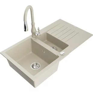 Beżowy Kolor baterii: Beżowy Dane techniczne: Zlewozmywak: Rozmiar: 900x505x200 mm Głębokość komory: 180 mm (większa), 115 mm (mniejsza) Wymiary komory: