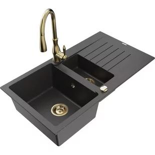 Czarny nakrapiany Kolor baterii: Złoty Dane techniczne: Zlewozmywak: Rozmiar: 900x505x200 mm Głębokość komory: 180 mm (większa), 115 mm (mniejsza) Wymiary komory: