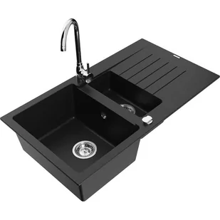 Czarny Kolor baterii: Chrom Specyfikacja produktu: Zlewozmywak: Rozmiar: 900x505x200 mm Głębokość komory: 180 mm (większa), 115 mm (mniejsza) Wymiary komory: