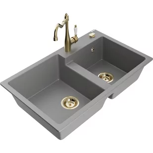 Szary Kolor baterii: Złoty Dane techniczne: Zlewozmywak: Rozmiar: 800x500x190 mm Głębokość komory: 180 mm (większa), 180 mm (mniejsza) Wymiary komory: