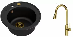 Zestaw zawiera zlewozmywak MORGAN 210 GraniteQ PURE CARBON czarny mat + bateria kuchenna JESSICA Q LINE z wyciąganą wylewką i funkcją prysznica + syfon save space z odpływem 3,5" SteelQ PVD złoty