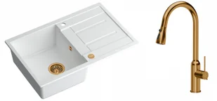 Zestaw zawiera zlewozmywak MORGAN 111 GraniteQ SNOW WHITE + bateria kuchenna JESSICA Q LINE z wyciąganą wylewką i funkcją prysznica+ syfon Push-2-Open save space z odpływem 3,5" SteelQ PVD miedziany