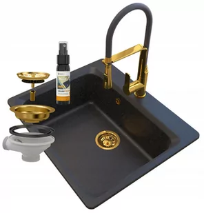 Jednokomorowy zlewozmywak granitowy 1️⃣ZANTE GOLDEN LINE - czarny z drobinkami złota ✅jednokomorowy ✅otwory w zlewie nawiercamy bezpłatnie na życzenie klienta według wzoru ✅możliwość dokupienia syfonu automatycznego 2️⃣VEGAS bateria kuchenna z dwufunkcyjną słuchawką w kolorze ZŁOTYM Bateria kuchenna wykonana z mosiądzu Głowica ceramiczna Standardowy otwór mocujący 35mm Obrotowa wylewka 360` Wyciągana wylewka Słuchawka 2-funkcyjna Powłoka odporna na wysoką temperaturę i przebarwienia Bateria bardzo łatwa w montażu W komplecie wszystko co potrzebne do montażu Specyfikacja i dane techniczne: Wysokość całkowita 43 cm Zasięg wylewki od środka baterii 21 cm Wyciągana słuchawka z giętkim wężem W komplecie: bateria, zestaw mocujący, uszczelki Wężyki do podłączenia baterii gratis 3️⃣Przyścienny syfon manualny z przelewem w kolorze ZŁOTYM Z możliwością podłączenia zmywarki lub pralki (oszczędność przestrzeni). *Jeżeli jesteście Państwo zainteresowani zlewem z syfonem automatycznym można dokupić dopłatę i otrzymać zlew z syfonem automatycznym (dopłatę można zakupić na naszych aukcjach w cenie 49 zł) 4️⃣Impregnat GraniProtect 30 ml 1 szt. GraniProtect 30 ml Specyfikacja: