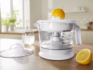 Opis produktu wyciskarka do cytrusów SZP 25 C3 do przygotowywania świeżych soków owocowych bieg w lewo/prawo - zmienny kierunek obrotów - zapewnia dokładniejsze wyciskanie soku 2 stożki do wyciskania do owoców różnej wielkości (n
