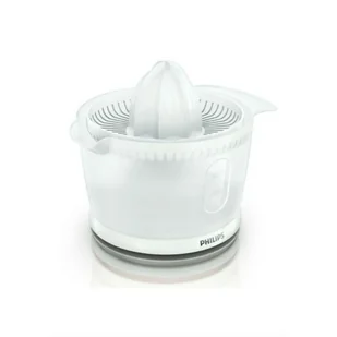 Elektro wyciskarka do cytrusów HR2738/00 marki Philips to praktyczne i wydajne urządzenie, zaprojektowane, by ułatwić przygotowanie świeżych soków z owoców cytrusowych. Dzięki mocy 25 W wyciskarka zapewnia odpowiednią wydajność do codziennego użytku domowego, gwarantując szybkie i równomierne wyciskanie soku. Posiada pojemność 500 ml, co pozwala przygotować wystarczającą ilość soku dla całej rodziny bez konieczności częstego opróżniania zbiornika. Obudowa wykonana jest z wysokiej jakości plastiku, co zapewnia lekkość i łatwość czyszczenia, a jej biały kolor łączy prostotę z nowoczesnym wyglądem, pasując do każdej kuchni. Urządzenie wyposażono w antypoślizgową podstawę, która stabilizuje wyciskarkę podczas pracy, zapobiegając niepożądanym przesunięciom i ułatwiając obsługę z komfortem i bezpieczeństwem. Konstrukcja wyciskarki została zaprojektowana z myślą o funkcjonalności, oferując praktyczne, łatwe w obsłudze i przechowywaniu urządzenie. Połączenie kompaktowych wymiarów i efektywności sprawia, że HR2738/00 Philips to odpowiednie rozwiązanie dla osób szukających niezawodnej i prostej w użyciu wyciskarki elektrycznej, która ułatwi wprowadzenie naturalnych soków do codziennej diety. Produkt łączy funkcjonalność techniczną z praktycznym designem, przeznaczony do użytku domowego z satysfakcjonującymi efektami.