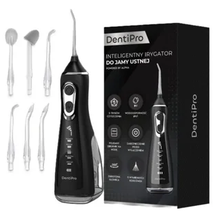 Irygator ALPHA DentiPro SWF-06 z 5 wymiennymi końcówkami do codziennej pielęgnacji jamy ustnej, usuwa do 99. 9% płytki nazębnej, zmniejsza krwawienie i zapalenie dziąseł, pomaga w usuwaniu kamienia nazębnego. 3-stopniowa regulacja ciśnienia wody.