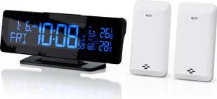 Wskaźnik temperatury, budzik i zegar w jednym urządzeniuBezprzewodowa stacja pogodowa Brandson z sygnałem DCFMinimalne i maksymalne wartości temperatury i wilgotnościTemperatura wewnętrzna i zewnętrzna, data, temperatura regulowana w °C i °F, drzemka, alarm, Ustawienie czasu 12/24h, ostrzeżenie przed mrozem; możliwość wyboru sekwencji wyświetlania dnia/miesiąca Kanał +/- i resetowanieMożliwość ustawienia dni tygodnia w 7 językachPodświetlenie: wysokie/niskie/wyłączone (pełna jasność/połowa jasności/wyłączone podświetlenie)4 tryby kolorów: tęcza (8 przełączanych kolorów), temperatura zewnętrzna (temperatura koloru od zimnego do ciepłego), pokrętło z 256 kolorami, naciśnięcie pokrętła: automatyczna zmiana koloruch jest 8 kanałów transmisji dla czujników zewnętrznych, tj. można podłączyć do 8 czujników2 czujniki zewnętrzne w zestawiePrzycisk drzemki na górze: