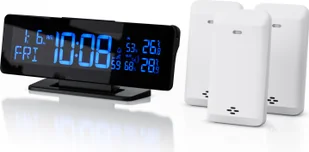 Wskaźnik temperatury, budzik i zegar w jednym urządzeniuBezprzewodowa stacja pogodowa Brandson z sygnałem DCFMinimalne i maksymalne wartości temperatury i wilgotnościTemperatura wewnętrzna i zewnętrzna, data, temperatura regulowana w °C i °F, drzemka, alarm, Ustawienie czasu 12/24h, ostrzeżenie przed mrozem; możliwość wyboru sekwencji wyświetlania dnia/miesiąca Kanał +/- i resetowanieMożliwość ustawienia dni tygodnia w 7 językachPodświetlenie: wysokie/niskie/wyłączone (pełna jasność/połowa jasności/wyłączone podświetlenie)4 tryby kolorów: tęcza (8 przełączanych kolorów), temperatura zewnętrzna (temperatura koloru od zimnego do ciepłego), pokrętło z 256 kolorami, naciśnięcie pokrętła: automatyczna zmiana koloruch jest 8 kanałów transmisji dla czujników zewnętrznych, tj. można podłączyć do 8 czujników3 czujniki zewnętrzne w zestawiePrzycisk drzemki na górze: