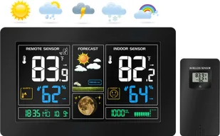 "Aktualne informacje o pogodzie, temperaturze wewnętrznej i zewnętrznej, a także wiele innych funkcji. . . . . . Ta stacja pogodowa oferuje to wszystko"Stacja pogodowa nie tylko wygląda bardzo elegancko, czarna obudowa i wyraźny, przyciemniany kolorowy wyświetlaczsprawiają, że jest łatwa do odczytania wieczorem lub w nocy. Urządzenie można ustawić w sypialni, salonie, kuchni lub biurze, umożliwiając sprawdzenie warunków pogodowych, temperatury wewnętrzneji wilgotnościo każdej porze dnia i nocy. Urządzenie wyświetla również godzinęi datęoraz posiada funkcję alarmu. Możesz zmierzyć temperaturę i wilgotnośćna zewnątrz za pomocą dołączonego czujnika bezprzewodowego(należy go również zainstalować na zewnątrz, aby uzyskać dokładne dane dotyczące temperatury zewnętrznej).
