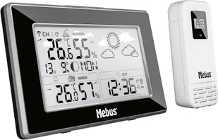 Prognoza pogody z symbolami pogodowymi. Kalendarz. Funkcja alarmu z powtarzaniem alarmu. Wyświetlanie faz księżyca. wyświetlanie godziny 12/24. Bezprzewodowa stacja pogodowa MEBUS 15x9.