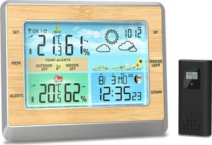 Cechy: 【Stacja pogodowa z naukowym czujnikiem zewnętrznym】 Temperaturai wilgotność zewnętrzna(maks. / min., wysoka / niska), prognoza pogody (następne 6-12 godzin), temperatura i wilgotność wewnętrzna, faza księżyca i data, alarm i drzemka, barometr Nasza stacja pogodowa ułatwia poznanie pogody i uzyskanie wygodniejszego i przyjemniejszego codziennego życia. 【Wygodnyi praktyczny】Jednocześnie można podłączyć do 3 bezprzewodowych zdalnych czujników zewnętrznych. Są one oparte na stacjach pogodowych, które monitorują pewne zmienne związane z klimatem, w tym zmiany temperatury, wilgotności i ciśnienia powietrza, aby zapewnić 6-12-godzinną prognozę. W zestawie z 4 haczykami i klejem, mini stacja meteorologiczna może być zamontowana na ścianie lub stole. 【Wielofunkcyjność】6-calowy kolorowy ekran LED z 4 poziomami jasności spełnia różne potrzeby.