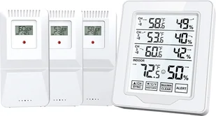 Cechy: 3czujniki: Termometr cyfrowy posiada 3 czujniki, które mogą monitorować 4 różne lokalizacje w tym samym czasie (3 czujniki + obszar wewnętrzny). Dzięki temu można łatwo kontrolować wilgotność i temperaturę w różnych pomieszczeniach i miejscach. Wielofunkcyjność: Ten termometr zapewnia najbardziej wiarygodne informacje o wilgotności i temperaturze. Obsługuje również alarm temperatury, zapis maks.