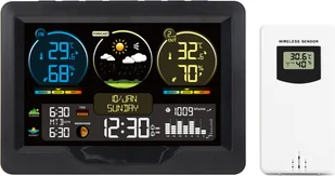 Cechy: ¡Duży kolorowy ekran ¡Stylowy i prosty wygląd, europejski i amerykański styl. Duży kolorowy ekran wyświetlający więcej potrzebnych informacji: Czas / Kalendarz / Tydzień / Wskaźnik komfortu / Ciśnienie powietrza / Pływy / Fazy księżyca / Temperatura i wilgotność wewnątrz i na zewnątrz / Prognoza pogody / Prognoza trendów / Lokalny wschód i zachód słońca. bezprzewodowy czujnik zewnętrzny do montażu na ścianie lub na stole, częstotliwość transmisji RF 433,92 MHz, zasięg transmisji 60 metrów na otwartej przestrzeni, wodoodporność IPX4. Możliwość podłączenia do 3 bezprzewodowych czujników zewnętrznych (1 czujnik w zestawie).