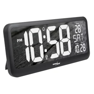 bold;">Cechy</span></br>- Duży, czytelny wyświetlacz<br />- Wyświetlanie czasu, daty i dnia tygodnia<br />- Pomiar temperatury wewnętrznej<br />- Funkcja codziennego alarmu<br />- Zakres pomiaru temperatury: od -9°C do +50°C<br />- Zasilanie bateryjne, przez USB lub sieciowe (dołączony zasilacz)<br />- Możliwość zawieszenia na ścianie lub postawienia<br />- Wymiary: 37x17 cm</p></br></div>