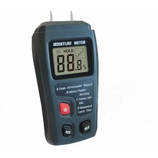 Profesjonalny miernik wilgotności drewna, łatwy w obsłudze, wyposażony w duży ekran LCD wyraźnie wyświetlający zmierzoną wartość wilgotności. Oferuje cztery skale kalibracji, blokadę danych, automatyczne wyłączanie po 15 minutach bezczynności i ostrzeżenie o niskim poziomie naładowania baterii.