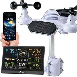 Profesjonalna stacja pogodowa ISAJ WHS1 pomiar temperatury i wilgotności wewnętrznej oraz zewnętrznej, pomiar prędkości i kierunku wiatru, pomiar ilości opadów deszczu, odczyt indeksu UV i natężenia światła, analiza trendów pogodowych oraz pamięć MIN / MAX, orientacyjna prognoza pogody oparta na ciśnieniu, łączność Wi-Fi i możliwość archiwizacji danych, przeznaczona do rozszerzonego i dokładnego monitorowania warunków atmosferycznych. To porównanie jasno pokazuje, że ISAJ WHS1 należy do klasy Premium, oferując funkcjonalność znacznie wykraczającą poza możliwości standardowych stacji domowych. Specyfikacja Parametry Model: ISAJ WHS1 Typ urządzenia: profesjonalna stacja pogodowa klasy Premium System pomiarowy: