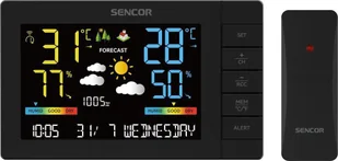 Stacja pogodowa - domowa, bezprzewodowa, do użytku wewnątrz pomieszczeń, z prognozą pogody, cyklicznym budzeniem, alarmem i odbiorem DCF, wyświetlanie temperatury, wilgotności, czasu i daty, zasięg czujnika bezprzewodowego 80 m, możliwość podłączenia maksymalnie 3 czujników bezprzewodowych, podłączenie do sieci, czujnik i zasilacz w zestawie, montaż na ścianie i stole, wymiary 84 × 138 × 27 mm (wys. × szer. × gł.)