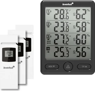 Stacja pogodowa Levenhuk Wezzer PLUS LP20 mierzy temperaturę i wilgotność w czterech miejscach jednocześnie. Jest to bardzo praktyczny przyrząd do monitorowania zmian klimatycznych i mikroklimatu w kilku pomieszczeniach, np. w budynkach na terenie posesji. Stacja bazowa stacji pogodowej mierzy temperaturę i wilgotność w miejscu instalacji i może być zamontowana na ścianie lub na płaskiej powierzchni. Trzy bezprzewodowe czujniki zdalne przesyłają dane do stacji bazowej za pośrednictwem łącza radiowego.