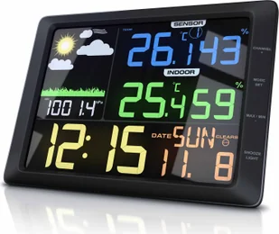 Cechy produktu Stacja pogodowa z kolorowym wyświetlaczem 20,7 cm (8,15") i dużymi cyframi dla najlepszej czytelności; podświetlenieZ czujnikiem zewnętrznym4 przyciski obsługi: CHANNEL/+; MODE/SET; Max/Min/-; SNOOZE/LIGHTFunkcje: Temperatura i wilgotność wewnątrz/na zewnątrz, ostrzeżenie o temperaturzeData i godzina, funkcja kalendarzaBudzik z funkcją alarmu i drzemki (przycisk drzemki)regulowany format czasu 12/24hTemperatura może być wyświetlana w °C i °FPrognoza pogody: słonecznie, częściowo pochmurno, pochmurno, deszczowo, burzowoCiśnienie barometryczne powietrza wyświetlane opcjonalnie w mmHg / hPa / inHg (dla ostatnich 12 godzin)Maksymalne/minimalne wartości wilgotności i temperatury (wewnątrz i na zewnątrz) dla ostatnich 24 godzinWyświetlanie punktu rosyPodświetlenie z 3 poziomami jasności (jasny, średni, cichy)Opcja ustawienia "wartości progowej ciśnienia" (2-4 mbar/h) i "wartości progowej burzy" (3-9 mbar/h)Informacja: Dni tygodnia wyświetlane są w języku angielskim Wymiary (wys. x szer. x gł.):