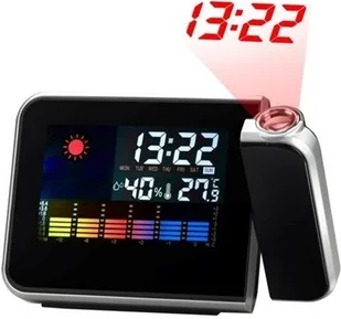 mini stacja pogodowa 4 w 1Cechy produktu: Cyfrowa stacja pogodowa z zegarem, budzikiem, kalendarzem i wbudowanym laserowym projektorem godzin. Posiada duży kolorowy wyświetlacz, który pokazuje aktualną temperaturę w pomieszczeniu, wilgotność i czas. wbudowana stabilna podstawa. Stan pogody jest wyświetlany graficznie za pomocą 4 symboli: