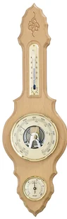 Stacja pogodowa wyprodukowana w Dolnej Frankonii, wykonana z naturalnego drewna bukowego z dużym barometrem (otwartym w środku), higrometrem i termometrem. Wymiary: 390 mm wysokości x 120 mm szerokości, Ø fabryczna 85 mm