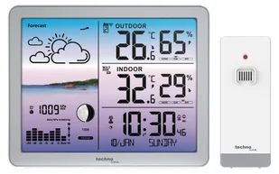 Odkryj innowacyjną stację pogodową WS 6520 - niezawodnego towarzysza dla idealnego klimatu w pomieszczeniach i nie tylko! Ta nowoczesna stacja pogodowa łączy w sobie wiele funkcji, aby stale informować Cię o aktualnej pogodzie, temperaturze i wilgotności w pomieszczeniach i na zewnątrz. Dzięki eleganckiemu wzornictwu i różnorodnym funkcjom jest zarówno praktyczna, jak i dekoracyjna. "Najważniejsze informacje w skrócie "Precyzyjny zegar sterowany radiowo DCF77 z opcją ręcznego ustaw iania: Zawsze na czas, nawet jeśli zegar sterowany radiowo wymaga ręcznej regulacji. Wyświetlanie daty i dnia tygodnia: