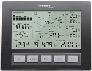 WS 2816Centrum pogodowe Czas przez PC lub ustawienie ręczne wyświetlanie czasu 12/24h Wyświetlanie daty Wyświetlanie temperatury wewnętrznej i zewnętrznej Wyświetlacz wilgotności wewnętrznej i zewnętrznej Pamięć MIN/maks Wyświetlanie chłodu wiatru (temperatura odczuwalna) Wyświetlanie punktu rosy Wyświetlanie prędkości i kierunku wiatru Wyświetlanie ciśnienia powietrza i 24-godzinna historia ciśnienia powietrza Wyświetlanie ilości opadów Prognoza sytuacji pogodowych i tendencji pogodowych Funkcja alarmu dla określonych warunków pogodowych Bezprzewodowy transfer danych do komputera za pomocą pamięci USB i oprogramowania komputerowego Montaż na ścianie lub na stoleDANE TECHNICZNEStacja pogodowa Wymiary (szer. x wys. x gł.): 222 x 173 x 42 mm Zasilanie: 3x Baby C (brak w zestawie)Czujnik TX58-IT Wymiary: Ø132 x 183 mm Zasilanie: 2x AA Mignon LR06 (brak w zestawie)Czujnik TX59N-IT Wymiary: