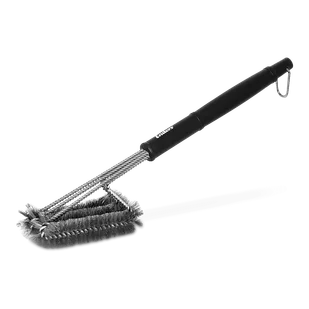 3 głowice do szybkiego i dokładnego czyszczenia dużych powierzchni rusztu. Nadaje się do emaliowanych rusztów stalowych, żeliwnych oraz rusztów ze stali szlachetnej. Trwałe włosie ze stali szlachetnej. Wytrzymały uchwyt z tworzywa sztucznego. Uchwyt ze stali szlachetnej umożliwiający zawieszenie na grillu.