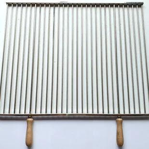 Solidne pręty wykonane ze stali nierdzewnej 304, średnica 6 mm Poszczególne pręty nie są spawane, ale mogą się obracać, dzięki czemu nie są narażone na rozszerzanie się z powodu wysokich temperatur w miarę upływu czasu. 2 drewniane uchwyty zapobiegające poparzeniom Wymiary odnoszą się do rzeczywistego rozmiaru grilla, należy uwzględnić dodatkowe 13,5 cm uchwytów.
