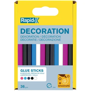 Klej kolorowy 7-8 mm - 115 g marki Rapid Uniwersalne, kolorowe sztyfty klejowe o średnicy 7 mm doskonale sprawdzą się w pracach dekoracyjnych i rękodziele oraz do drobnych napraw. W zestawie znajduje się 36 szt. przezroczystych sztyftów. Kolory: biały, wiśniowy, jasny niebieski, ciemny niebieski i czarny.