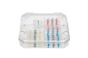 125 °C kurczy się do połowy pierwotnej średnicy, zapewniając ciasne dopasowanie, z wyjątkiem ø 1,5 mm i ø 1 mm. 450-, 225-, 162- lub 125-częściowy zestaw złączek kablowych : 22-częściowy zestaw listew zaciskowych : listwy zaciskowe z 12 otworami każda nominalny zakres przyłącza: 1;5–2;5 mm² 7-częściowy zestaw złączek lutowniczych :