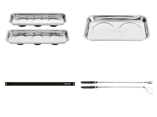 w zestawie 2x kołki rozporowe i 2x śruby zestaw narzędzi inspekcyjnych: 1x lusterko inspekcyjne, 1x podnośnik magnetyczny z lampką Led, 3x baterie 1,5V Lr44, instrukcja Dane techniczne Zestaw tac magnetycznych: wymiary ok. 226 x 65 x 29 mm, dna magnetyczne Ø 40 mm, siła magnetyczna ok. 800–1000 Gs, waga ok.