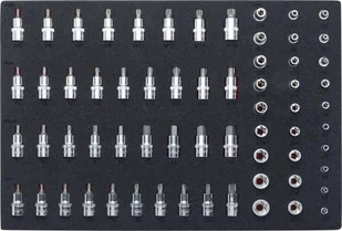 Liczba narzędzi: 64; Szerokość wewnętrzna szuflady [mm]: 563; Głębokość wewnętrzna szuflady [mm]: 393; Długość [mm]: 563; Wymiary czworokąta napędowego [mm (cal)]: