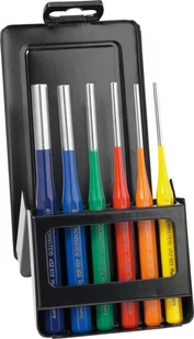 Zestaw wybijaków zawleczek, bardzo twardych exclusiv 6-cz. RENNSTEIG Zestaw wybijaków zawleczek, bardzo twardych exclusiv Wykonanie: podobne do DIN 6450, z 8-krawędziowej, na wskroś ulepszanej cieplnie, wysokostopowej stali narzędziowej (59 HRC). Ok. 9% twardsze niż zwykłe wybijaki zawleczek. Chromowane, rękojeści powlekane proszkowo, kolory dla łatwej identyfikacji średnicy, z bezpieczną główką do pobijania.