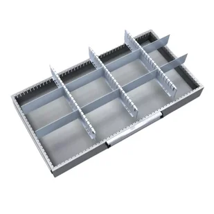 zestaw poprzecznych i podłużnych przegródek, które pomogą w utrzymaniu porządku w szufladach szaf warsztatowych MECHANIC o wymiarach wewnętrznych 780 x 380 mm wykonane z cynkowanej blachy stalowej 3 warianty do stworzenia 8, 12 i 15 przedziałów wysokość przegród zawsze 64 mm