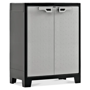 Mebel wykonano z wysokiej jakości plastiku, dodatkowo wzmocnionego w wykończeniu metalowymi elementami. Szafa tarasowa Titan Low Cabinet jest czarno-szara, więc dobrze wpasuje się w każde otoczenie. Dodatkowo wzmacniana konstrukcja półek i metalowe zawiasy gwarantują dużą solidność konstrukcji. Wewnątrz mamy do dyspozycji dwie półki o nośności 30 kg każda, które można dowolnie ustawiać, zależnie od potrzeb. Szafa tarasowa świetnie sprawdzi się w piwnicy, garażu czy domowym warsztacie do majsterkowania.