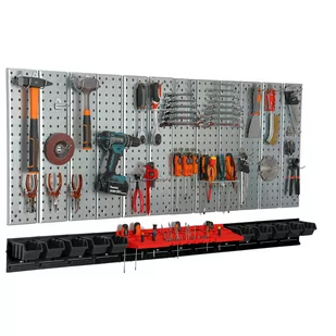 Metalowa tablica narzędziowa uchwyty 10 kuwet Perforowana tablica narzędziowa jest praktycznym rozwiązaniem dla profesjonalistów i hobbistów majsterkowania, aby utrzymać porządek w miejscu pracy, w garażu, w warsztacie, czy w atelier. Produkt wykonany z odpornej na zarysowania stali. W skład zestawu wchodzą uchwyty na elektronarzędzia, uniwersalne haki, uchwyty na klucze płaskie oraz uchwyty na narzędzia ręczne. Perforowana powierzchnia paneli pozwala na dowolny układ haczyków na swojej płaszczyźnie, dzięki czemu każdy użytkownik dostosuje zestaw do swoich indywidualnych potrzeb. Cechą charakterystyczną zestawu jest jego modułowość, umożliwiająca rozbudowę zestawu o kolejne elementy, tworząc finalnie estetyczną i użyteczną całość.
