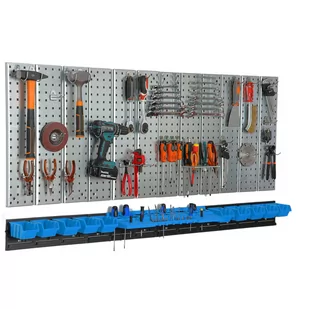 Metalowa tablica narzędziowa uchwyty 10 kuwet Perforowana tablica narzędziowa jest praktycznym rozwiązaniem dla profesjonalistów i hobbistów majsterkowania, aby utrzymać porządek w miejscu pracy, w garażu, w warsztacie, czy w atelier. Produkt wykonany z odpornej na zarysowania stali. W skład zestawu wchodzą uchwyty na elektronarzędzia, uniwersalne haki, uchwyty na klucze płaskie oraz uchwyty na narzędzia ręczne. Perforowana powierzchnia paneli pozwala na dowolny układ haczyków na swojej płaszczyźnie, dzięki czemu każdy użytkownik dostosuje zestaw do swoich indywidualnych potrzeb. Cechą charakterystyczną zestawu jest jego modułowość, umożliwiająca rozbudowę zestawu o kolejne elementy, tworząc finalnie estetyczną i użyteczną całość.