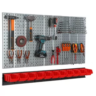 Metalowa tablica narzędziowa uchwyty 11 kuwet Perforowana tablica narzędziowa jest praktycznym rozwiązaniem dla profesjonalistów i hobbistów majsterkowania, aby utrzymać porządek w miejscu pracy, w garażu, w warsztacie, czy w atelier. Produkt wykonany z odpornej na zarysowania stali. W skład zestawu wchodzą uchwyty na elektronarzędzia, uniwersalne haki, uchwyty na klucze płaskie oraz uchwyty na narzędzia ręczne. Perforowana powierzchnia paneli pozwala na dowolny układ haczyków na swojej płaszczyźnie, dzięki czemu każdy użytkownik dostosuje zestaw do swoich indywidualnych potrzeb. Cechą charakterystyczną zestawu jest jego modułowość, umożliwiająca rozbudowę zestawu o kolejne elementy, tworząc finalnie estetyczną i użyteczną całość.