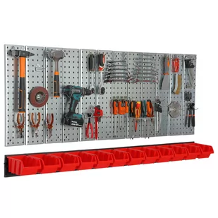 Metalowa tablica narzędziowa uchwyty 12 kuwet Perforowana tablica narzędziowa jest praktycznym rozwiązaniem dla profesjonalistów i hobbistów majsterkowania, aby utrzymać porządek w miejscu pracy, w garażu, w warsztacie, czy w atelier. Produkt wykonany z odpornej na zarysowania stali. W skład zestawu wchodzą uchwyty na elektronarzędzia, uniwersalne haki, uchwyty na klucze płaskie oraz uchwyty na narzędzia ręczne. Perforowana powierzchnia paneli pozwala na dowolny układ haczyków na swojej płaszczyźnie, dzięki czemu każdy użytkownik dostosuje zestaw do swoich indywidualnych potrzeb. Cechą charakterystyczną zestawu jest jego modułowość, umożliwiająca rozbudowę zestawu o kolejne elementy, tworząc finalnie estetyczną i użyteczną całość.